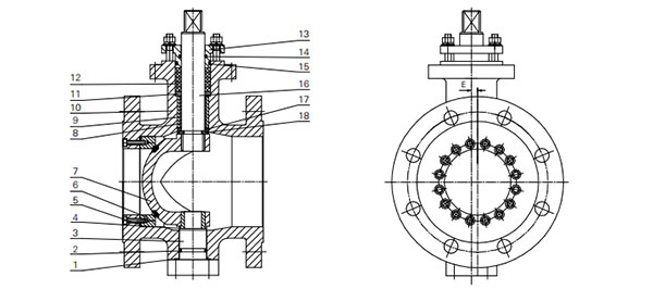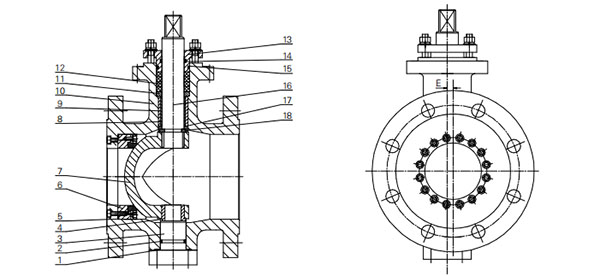 10.閥體 | 11.填料墊 | 12.填料 | 13.填料壓蓋 | 14.O型圈 | 15.O型圈 | 16.閥桿 | 17.擋圈環(huán) | 18.對開擋圈 |