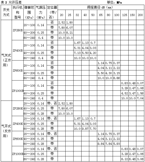 注 1)對(duì)于ZXMW型套筒波紋管密封調(diào)節(jié)閥,最大允許壓差為1.0MPa,表中數(shù)據(jù)若數(shù)值小于1.0MPa則不變,若數(shù)值大于1.0MPa,則取值1.0MPa。