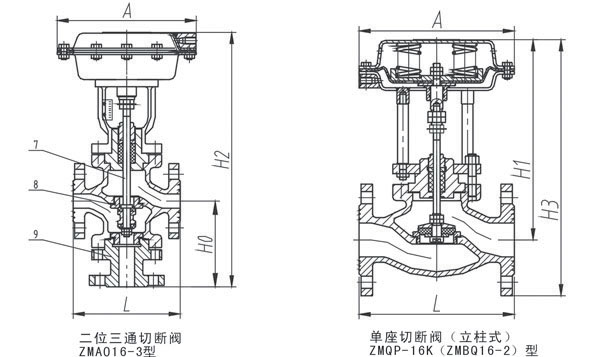 3.ZMAQ16-3:氣動(dòng)薄膜三通切斷閥;A:正作用