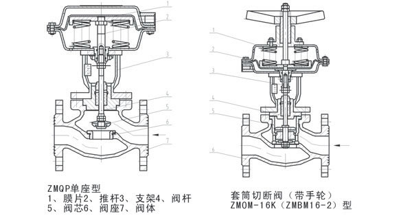 2.ZMQM:氣動(dòng)薄膜套筒切斷閥,如:ZMQM-16K:K:氣開式;M:閥芯型式,套筒;B:氣閉式